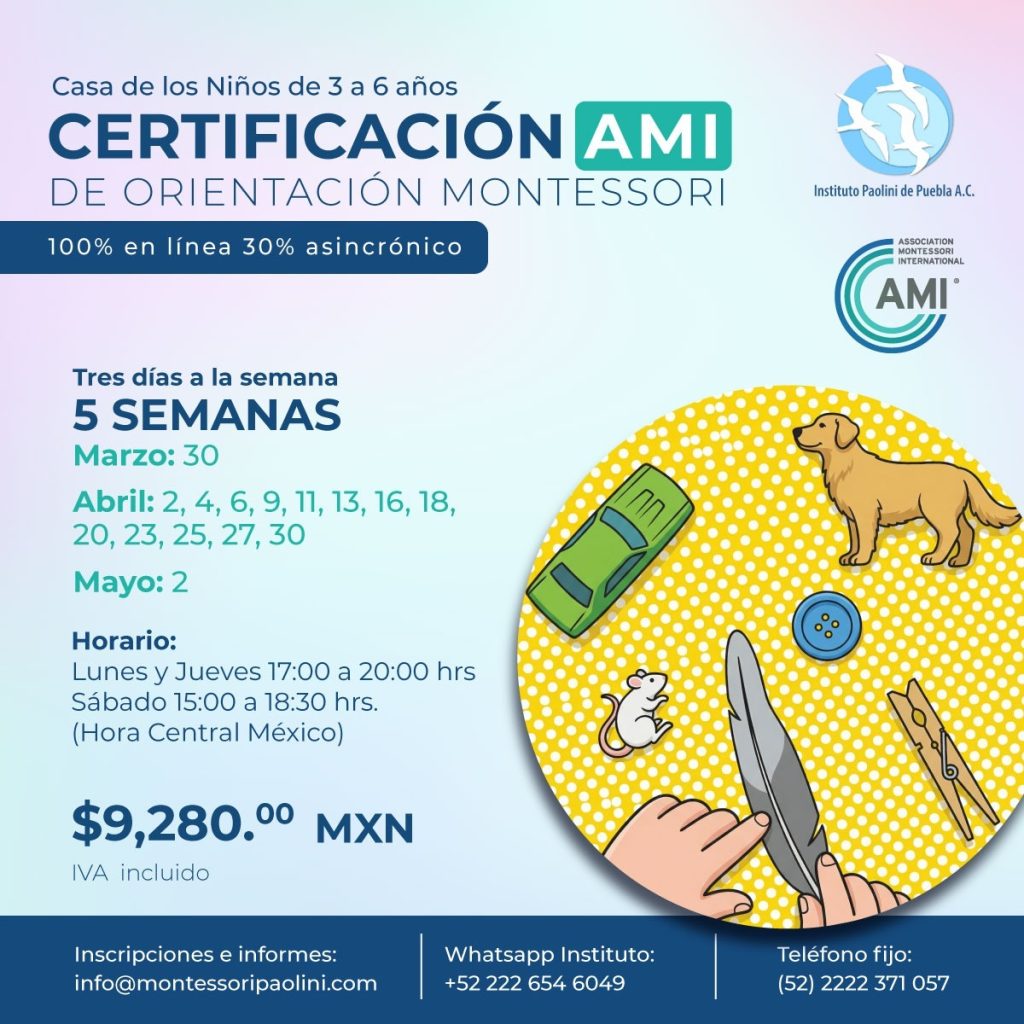 Certificado AMI de Orientación Montessori Niños de 3 a 6 años, con validez Internacional.